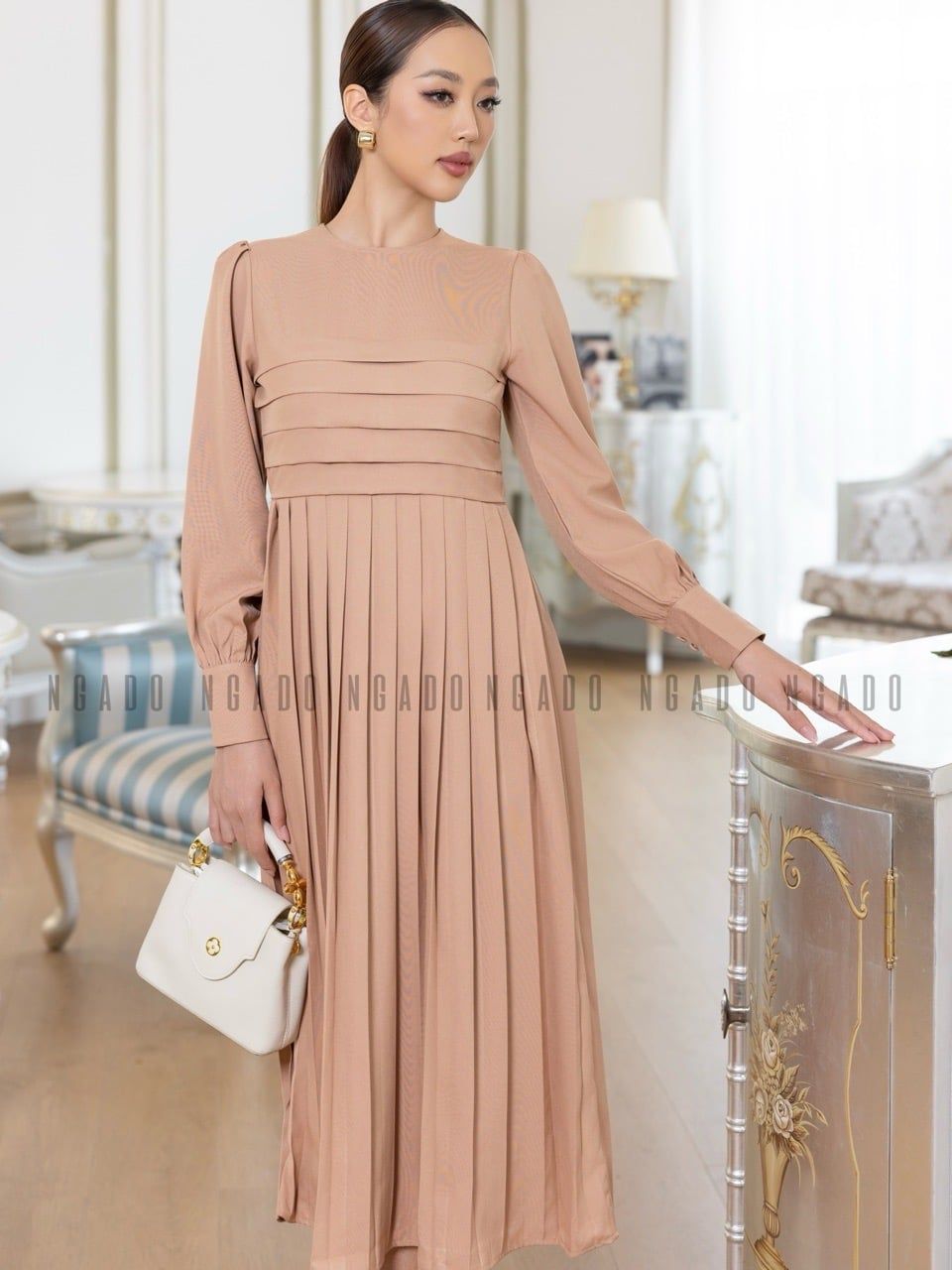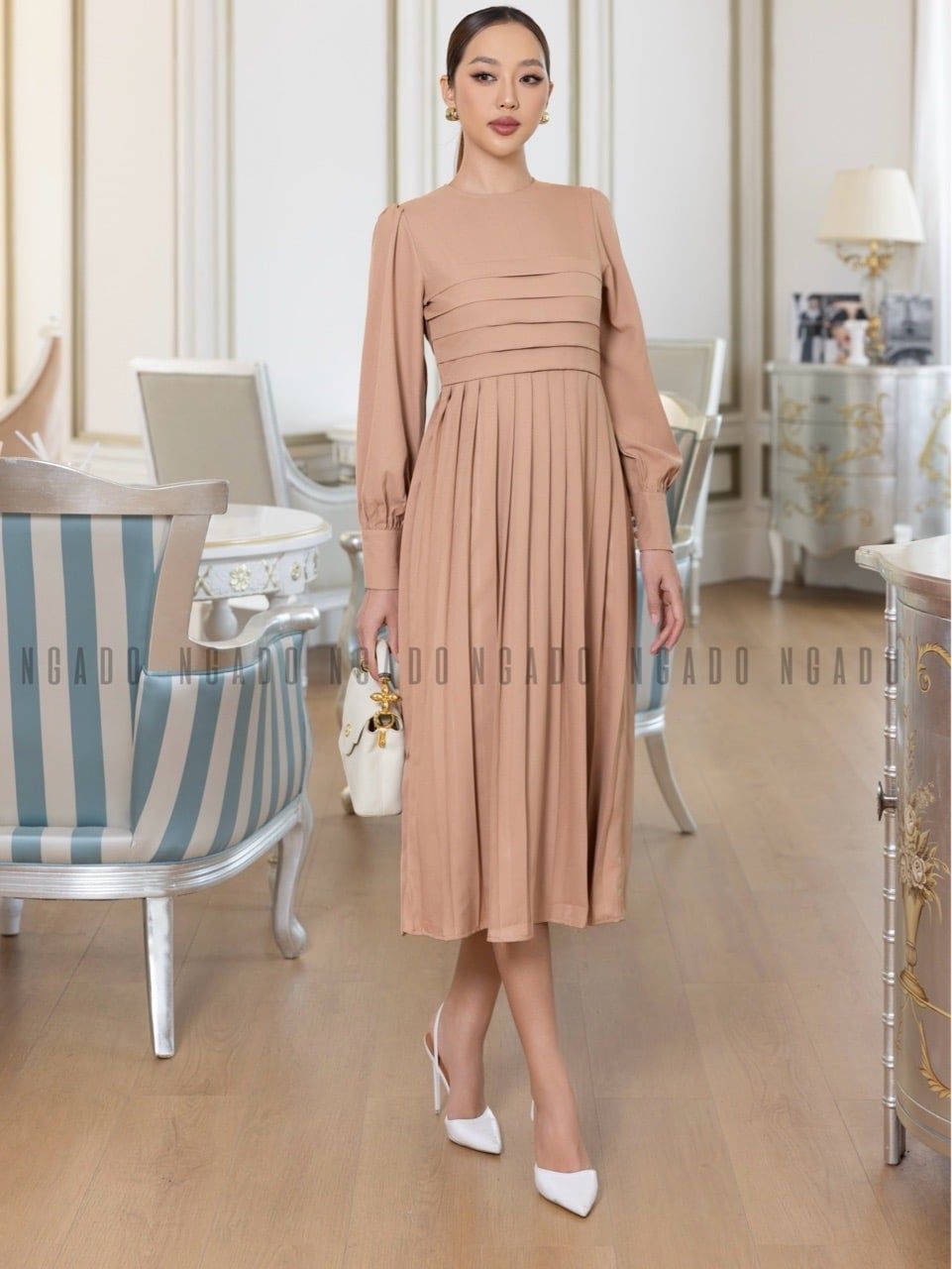 Đầm nâu xếp ly dài tay [LM x ND]