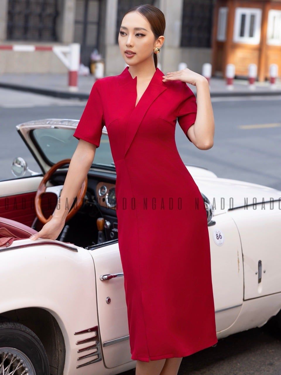 Đầm đỏ cổ vest xẻ tà [LM x ND]