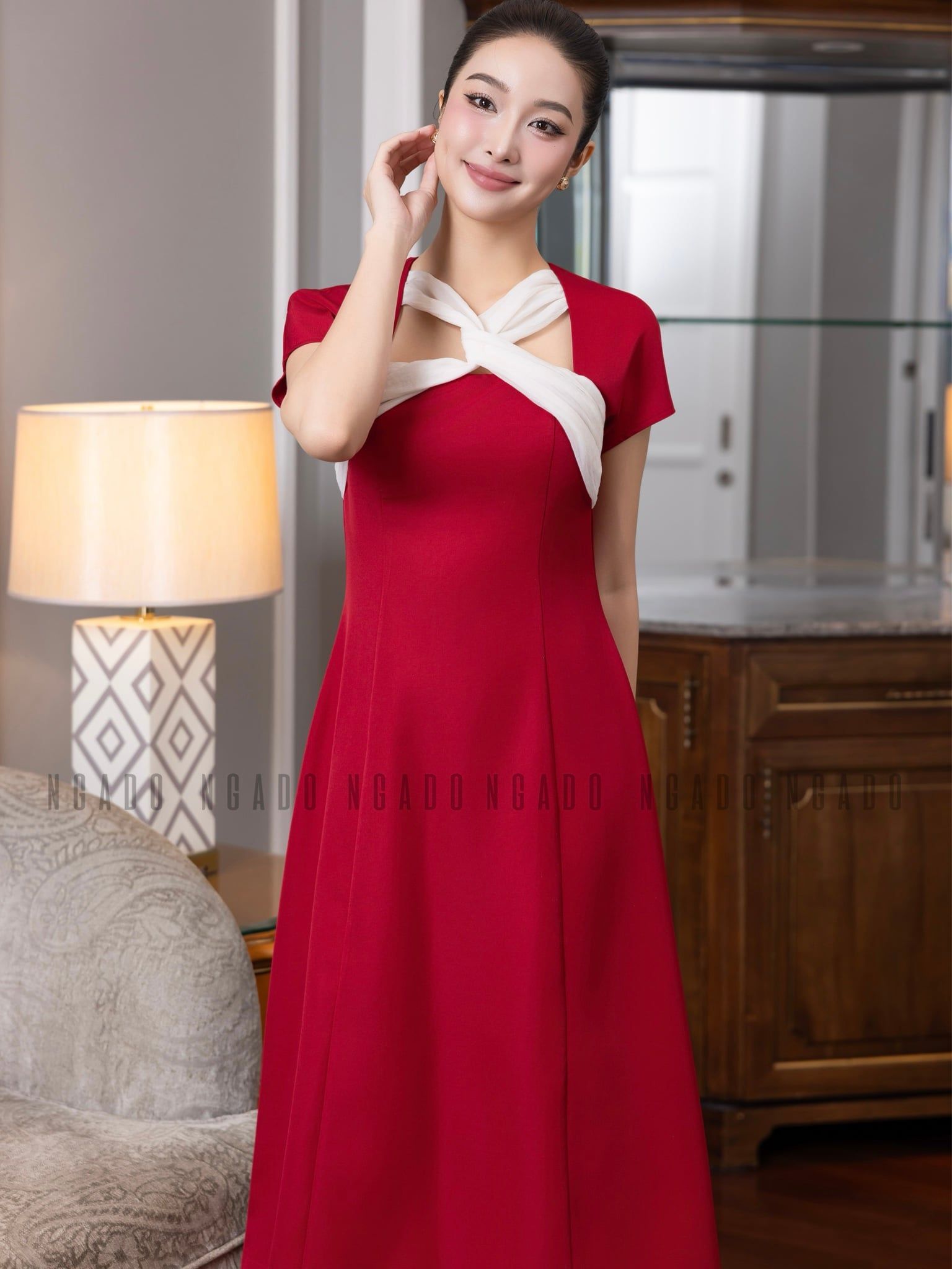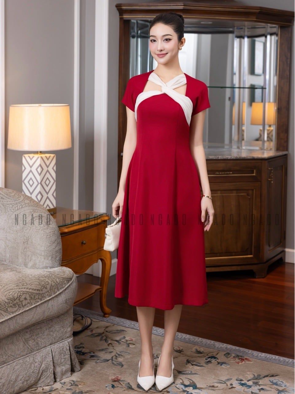 Đầm đỏ phối trắng