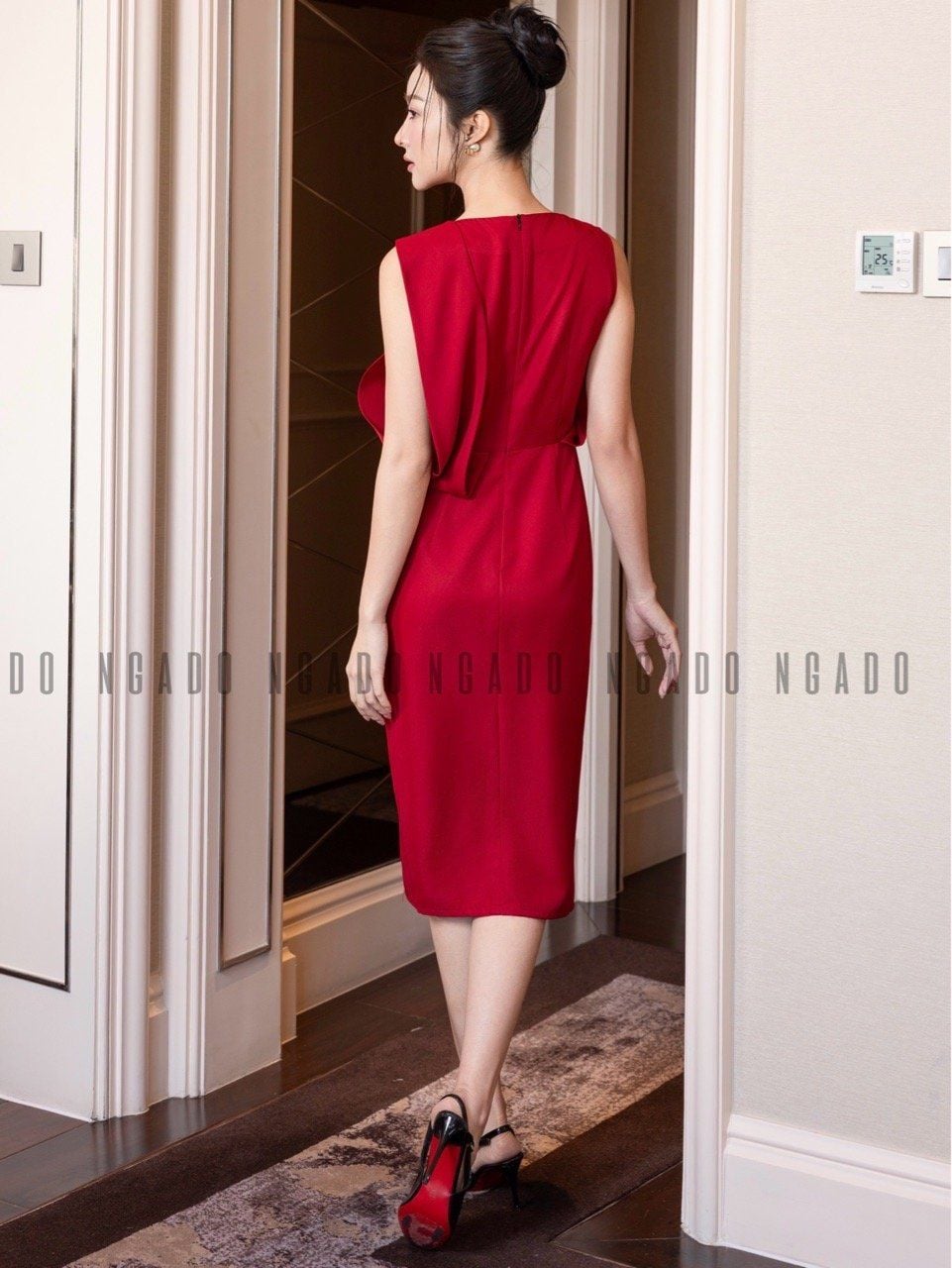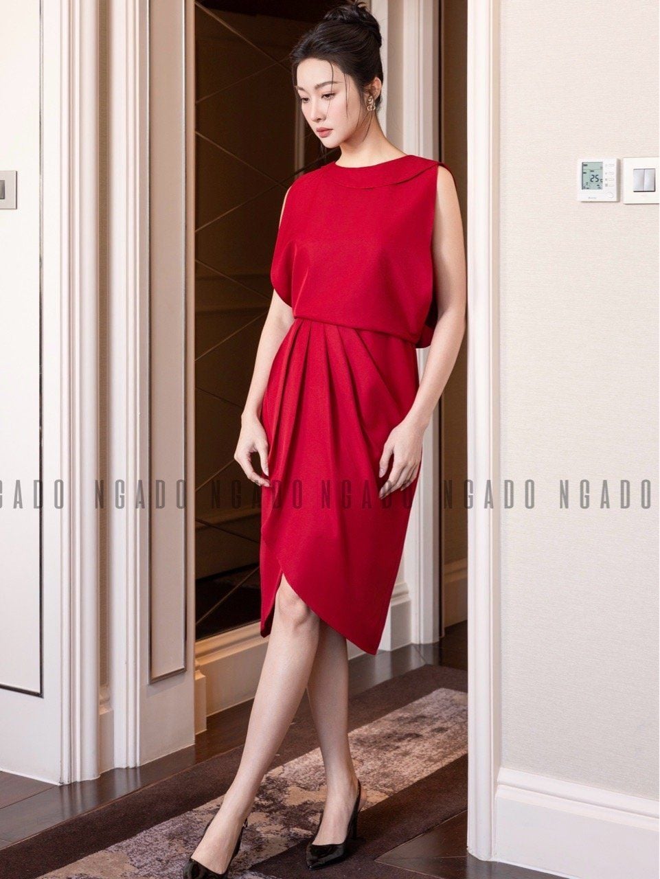 Đầm đỏ sát nách cổ tròn