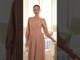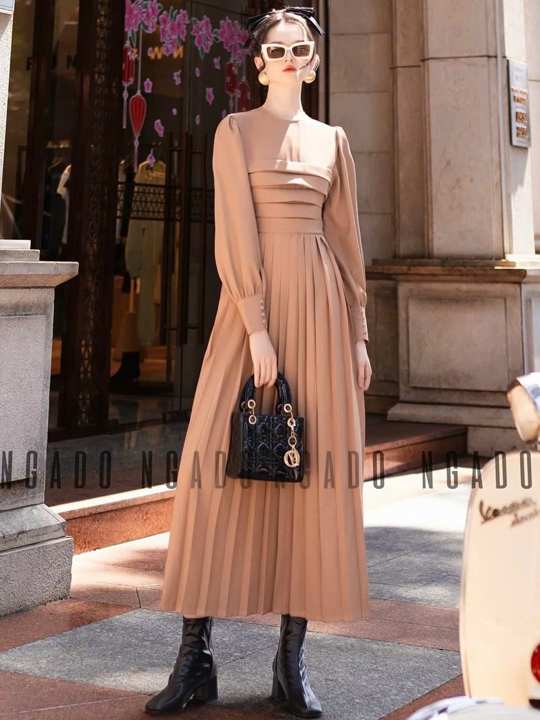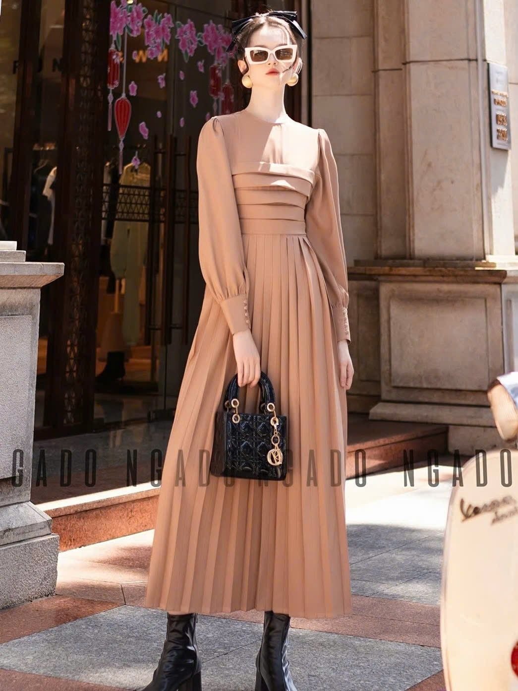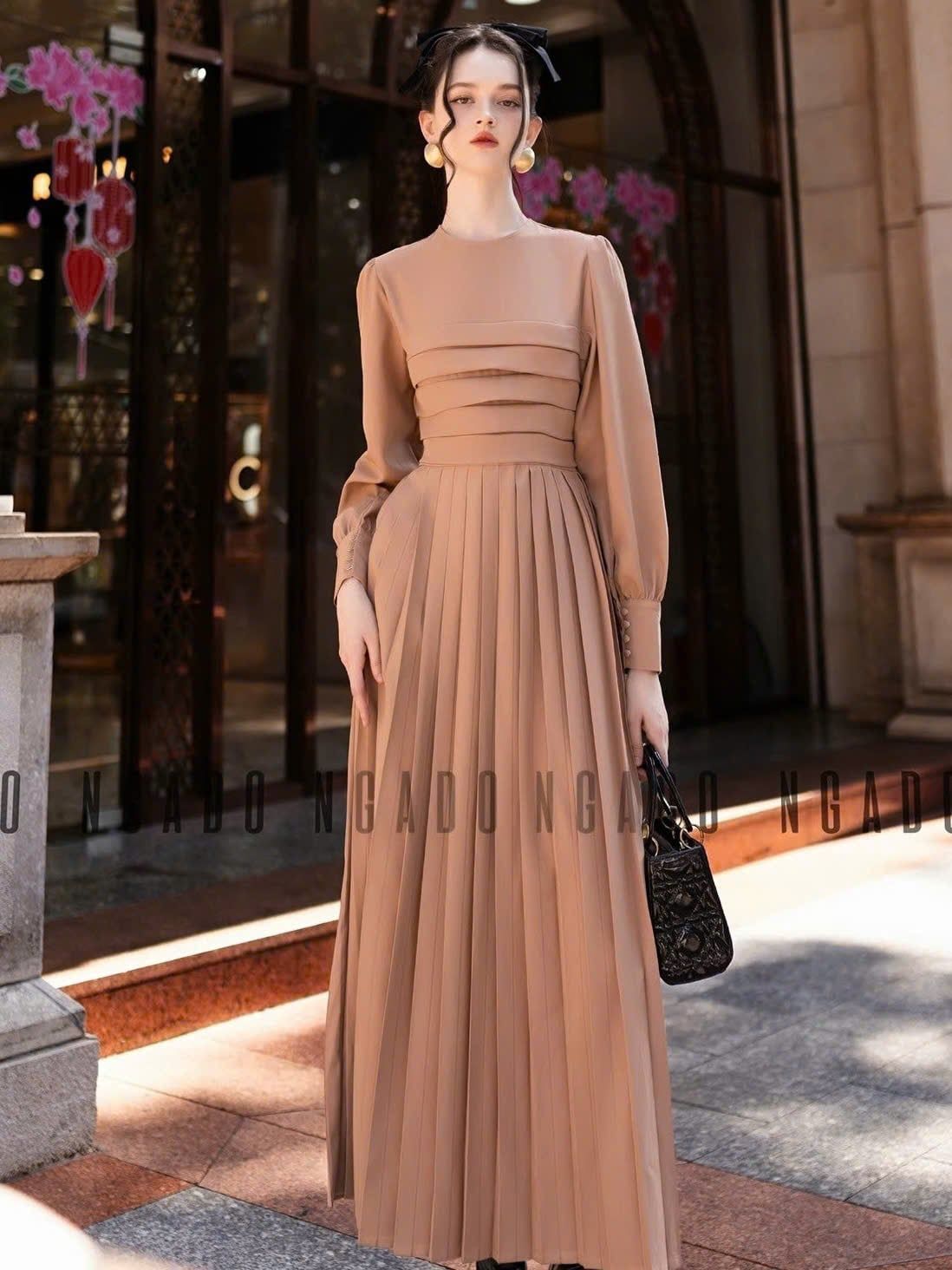 Đầm nâu xếp ly dài tay