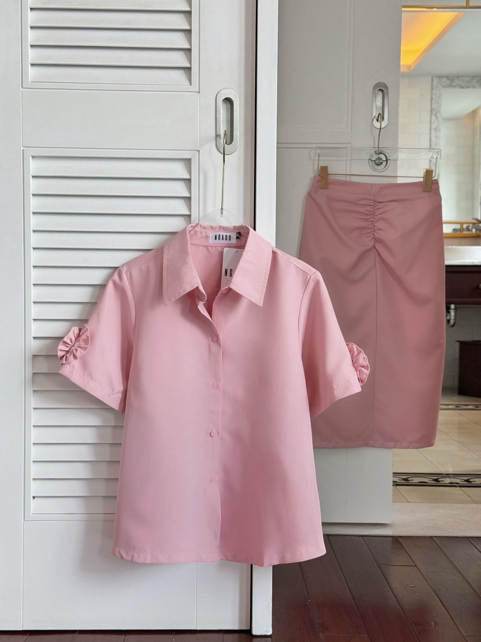 Set áo váy hồng tay hoa